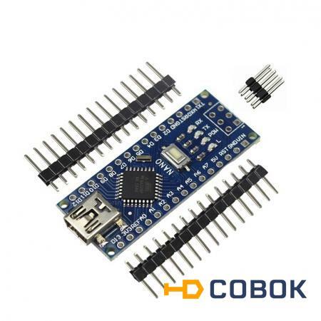 Микроконтроллерная плата Arduino Nano на микроконтроллере ATmega328 и преобразователе USB->COM CH340G. Имеет небольшие размеры и может использоваться в лабораторных работах. Отсутствует силовой разъем постоянного тока, питание подается через кабель Mini-B USB. Преобразователь USB -> COM на микросхеме CH340G позволяет обновлять прошивку Arduino без использования программатора.