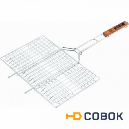 Решетка-гриль предназначена для приготовления мяса, рыбы, овощей над углями на открытом воздухе. Особая конструкция (зазоры между плоскостями) предусматривает приготовления продуктов целиком, сохраняя их сочными. Увеличенные опорные стержни обеспечивают устойчивое положение на мангале или барбекю и позволяют задействовать всю рабочую поверхность.