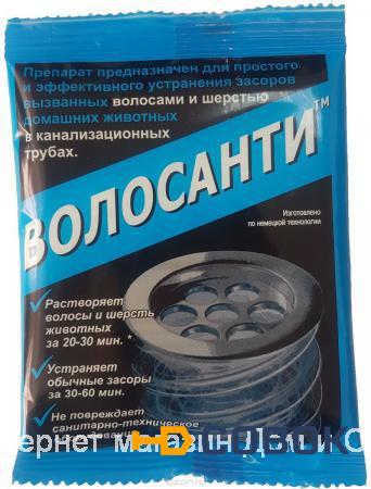 высыпать средство в сливное отверстие, залить теплой водой.Через полчаса (максимум час), промыть большим количеством воды – вариант для глубоких загрязнений;развести гранулы в воде и медленно залить в слив.Спустя полчаса, смыть остатки засора водой – метод применяют, если волосы скопились на крестовине отверстия или сразу за ним.Расфасован «Волосанти» в прочные герметичные пакеты по 50 грамм.Упаковка предназначена для одноразового использования.Дозы из 2-х пакетов достаточно, чтобы сделать профилактическую чистку (желательно проводить примерно раз в 2-3 месяца).Или удалить небольшой засор.В более серьезных случаях рекомендуется взять дозировку не менее 4-х пакетов.К слову, цена средства от засора Антиволос вполне демократичная, что позволяет не экономить на прочистке труб.10 преимуществ использования чистящего активатора Волосанти1) Средство идеально подходит для устранения различных видов засоров и профилактических мероприятий.2) Периодическое использование добавки позволит избежать образования и уплотнения осадков в канализационной системе.3) Состав поверхностно-активных веществ (ПАВов), участвующих в процессе очищения труб, не только устраняет объемы засора.Он полностью обеззараживают отходы.4) За счет экологичности и нетоксичности сухой концентрат Антиволос безопасен для людей, домашних питомцев и окружающей среды.5) Регулярное использование средства от засоров Волосанти значительно сэкономит ваши средства.Вам не придется прибегать к дорогостоящей помощи сантехников.6) Простое применение устранителя засорений не вызывает затруднений и позволяет легко приготовить раствор.7) Представленный препарат изготовлен российским предприятием ООО «Мегатериум» г.Москва.Специализация завода – это разработка и производство товаров бытового назначения.Продукция компании более 25 лет пользуется доверием и спросом у потребителей.Приемлемая цена позволяет заказать и купить утилизатор антизасор любому желающему.Продуктивность применения препарата подтверждается положительными отзывами и комментариями.Представленный в интернет магазине Дом и Сад видео обзор очистителя подробно рассказывает о его назначении и применении.В настоящее время чистка канализационной системы этой маркой активатора считается одной из самых эффективных.Он применяется не только жильцами в бытовых условиях в квартире.Но и в частном доме, на даче, в парикмахерских и в производственных условиях.Даже если проблема засора канализации вас не беспокоит, имеет смысл заказать состав Волосанти сейчас для профилактических мер.Так, вы избежите возникновения проблем в будущем.И продлите эксплуатационный срок трубам и другим элементам инженерной системы.Очиститель Антиволос можно использовать для очистки сливных стоков и труб в любых видах сантехники:Ванной, раковине, душевой кабине, унитазе, мойке и других.Где заказать и приобрести средство очиститель засоровОнлайн интернет магазин Дом и Сад - многолетний прямой партнёр продаж ООО Мегатериум г.Москва.Советуем купить на нашем сайте по цене производителя чудо препарат Волосанти для прочистки засоров в сантехнических сливах ванной.А также, раковины, унитаза и прочих видов сантехники.Это действительно одно из лучших и недорогих средств в мире.Оно идеально подходит для самостоятельной очистки з