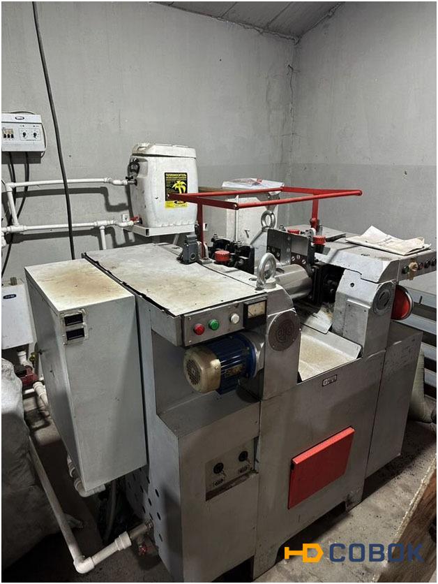 Вальцы ПД-320 160/160 Диаметр рабочей части валков - 160 мм. Длина рабочей части валков - 320 мм. Длина рабочей части между стрелами - 290 мм. Скорость валков: · переднего 29 ± 2 об/мин. 14,6 м/мин. · заднего 36 ± 2 об/мин. 18 м/мин. Фрикция (отношение скоростей вращения валков) 1 : 1,25. Зазор между валками, регулируемый эл.двигателем и вручную по лимбу. Диапазон 0,2…8 мм. Твердость рабочей части валков, HRC 50..55 Обогрев валов – горячая вода, пар, масло, подаваемые в полость валка через вращающиеся узлы. Температура валков 20-200°С. Зависит от температуры теплоносителя. Обычно для резины используют нагрев валков 55/65°С. Установлены краны для регулирования горячей и холодной воды, подаваемой в полость валков. Охлаждение валков – холодная вода, подаваемая через краны в полость валков. Установленная мощность электродвигателя мотор-редуктора привода валков - 7,5 кВт. Мощность электродвигателя разведения валков 0,6 кВт. Общая потребляемая мощность 8 кВт. Габариты 1300*900*1450 мм. Масса 1100 кг. В хорошем рабочем состоянии
