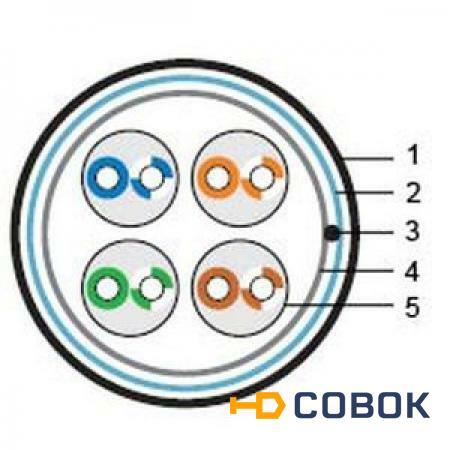 1 - Внешняя оболочка2 - Экран - фольга3 - Дренажный провод4 - Защитная пленка5 - Витая пара solidОписание:Экранированный медный кабель, 4 пары, категория 5e, одножильныйЭкран: алюминиевая фольгаКабель подходит для горизонтальной прокладки вне помещенийМатериалы:Проводящий материал: проволока из мягкой отожженной электролитической медиИзоляция жил: полиэтилен высокой плотностиВнешняя оболочка: полиэтилен черного цветаЭкран: алюминиевая фольга, спирально накрученная с нахлестом 25% или 5 мм, толщина – 0,025 мм, ширина – 20 ммТехнические характеристики:Диаметр проводника (жилы): 0,51 мм (24 AWG) (Справочные таблицы по AWG)Диаметр проводника с оболочкой: 0,9 ± 0,02 ммВнешний диаметр (размер) кабеля: 7,0 ± 0,2 ммТолщина внешней оболочки: 0,65 ммМинимальный радиус изгиба: 4 внешних диаметра кабеляУдлинение жилы: не менее 14%Рабочая температура: -40°C – +60°CВес 1 км кабеля: 35 кгСтандартная упаковка: 500 м