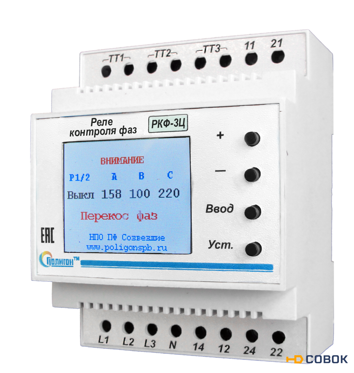 Блок РКФ-3/1-Ц предназначен для контроля напряжения и тока трехфазной сети и защиты оборудования, чувствительного к аварии сети (двигатели, трехфазные выпрямители).Обеспечивает