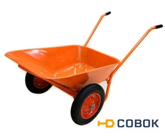 Двухколесная строительная (садовая) тачка с цельнолитыми колесами, кузов окрашеный, грузоподъемность до 120 кг. Объем кузова - 70 литров.