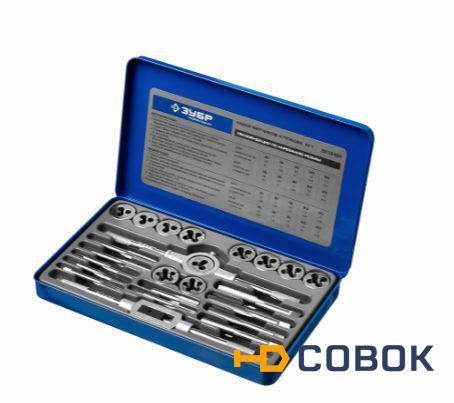 Метчики метрические (10 шт.): 5х0,8, 5х0,5, 6х1,0, 6х0,75, 8х1,25, 8х1,0, 10х1,5, 10х1,25, 12х1,75, 12х1,5. Метчик трубный (1 шт.) - 1/8-27. Плашки метрические (10 шт.): 5х0,8, 5х0,9, 6х1,0, 6х0,75, 8х1,25, 8х1,0, 10х1,5, 10х1,25, 12х1,75, 12х1,5. Плашка трубная (1 шт.) - 1/8-27. Метчикодержатель Д25 мм M3-M12. Плашкодержатель M5-M12. Комплектные метчики позволяют нарезать резьбу с повышенным уровнем точности Метчики, плашки и сверла изготовлены из быстрорежущей стали Р6М5 Метчики изготовлены в соответствии с ГОСТ 3266-81 Плашки изготовлены в соответствии с ГОСТ 9740-71 Сверла изготовлены в соответствии с ГОСТ 10902-77 Резьбонарезной инструмент ЗУБР ПРОФЕССИОНАЛ отличается высокой надежностью, что позволяет применять его даже в тяжелых условиях производства. Набор предназначен для нарезания и калибрования внутренней и внешней метрической и трубной резьбы в сквозных и глухих отверстиях в сталях с пределом прочности до 900Н/мм2, цветных металлах, пластике.
