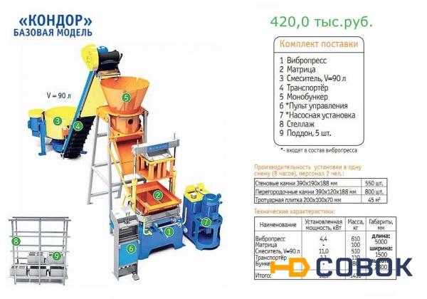КОНДОР 1"- высокопроизводительная установка, предназначенная для изготовления стеновых камней и тротуарной плитки из жесткой бетонной смеси методом вибропрессования в условиях частного строительства и коммерческого производства в малом бизнесе.